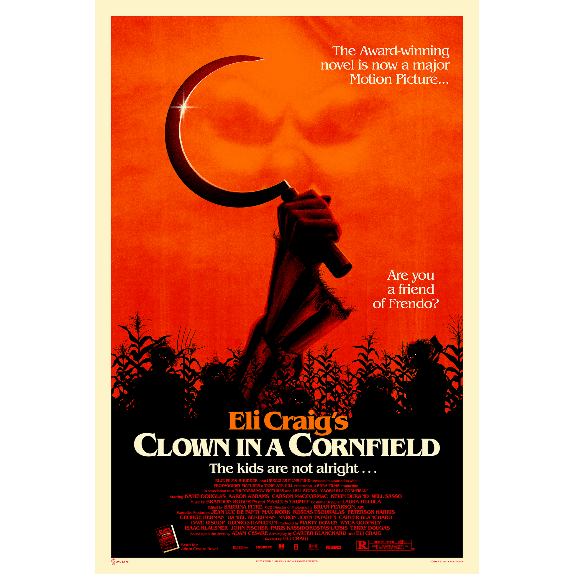 Artist Matt Ryan Tobin is also the cover illustrator for the original novel series, so who better to handle the cinematic arrival of Frendo than one his oldest friends? Matty’s artwork pays homage not only to the original novel, but yet another literary horror famously set around a cornfield.